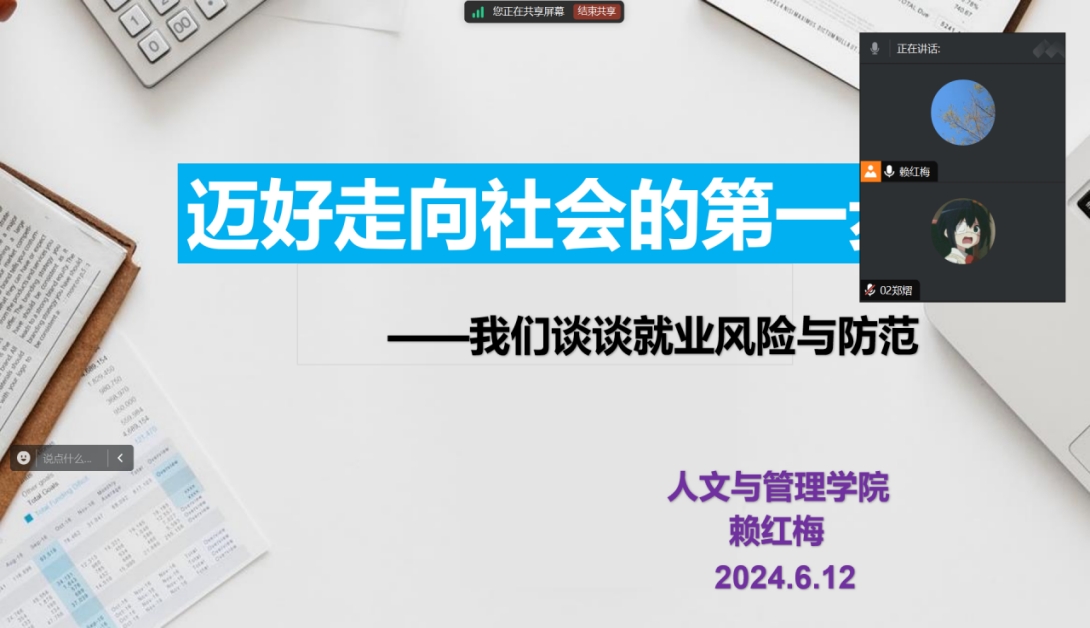 2024届的人文学子们临近毕业,即将走出人生的第一步,离开校园进入社会,完成从学生到职场人的转换,因此防范好求职中的骗局至关重要。人文与管理学院心理教研室赖红梅老师于6月12日下午2:30在线上为2024届毕业生进行了“迈好走向社会的第一步——我们谈谈就业风险与防范”就业辅导讲座。
