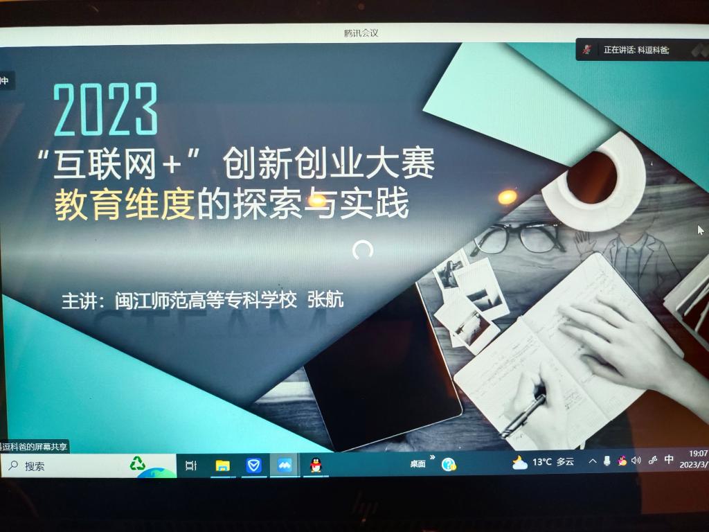 2023年3月18日晚19:00,“三创”培育提优系列专题讲座--《“互联网+”创新创业大赛教育维度的探索与实践》,由福州市科普协会会长、三创学院张航老师在腾讯会议平台主讲。