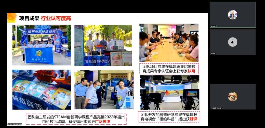 张航老师首先对职教赛道的相关规则做了简要介绍,接着重点围绕教育维度的五大方面进行解读,对如何做到“从教育中来,到教育中去”提出自己独到的见解,最后以自身指导并获得省赛金奖的项目---《酷酷蛙研学助手》为例,分享了如何突出大赛的育人本质,在项目的整体设计和实施过程中体现多学科交叉、专创融合、产学研协同创新等路径的深入思考。