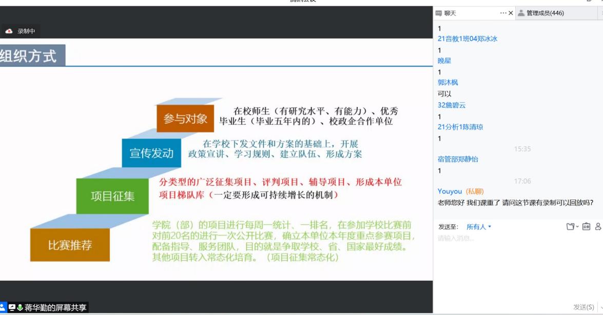即使疫情突发,也阻挡不了我们行动的脚步。此次大赛启动,我们邀请到三创方面的著名专家蒋华勤教授,解读第八届“互联网+”大学生创新创业大赛参赛政策,从校赛备赛、项目遴选、团队组建、赛道分析、专利壁垒等模块开展线上专题讲座,深受广大师生好评。