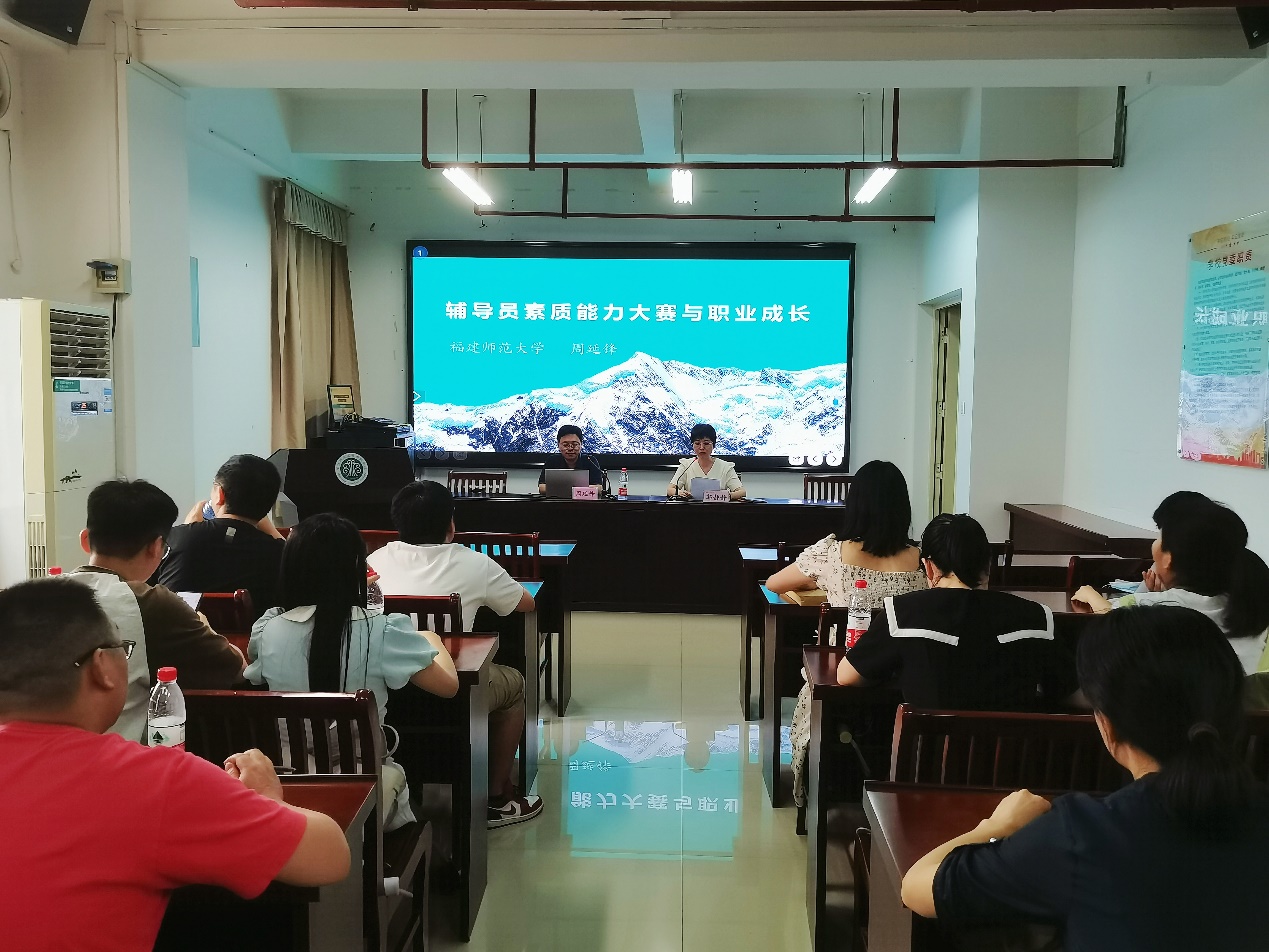 本次培训邀请了福建师范大学团委书记周延锋主讲。培训由学生处处长郭静静主持,参与学校第五届辅导员素质能力大赛的辅导员参加培训。
