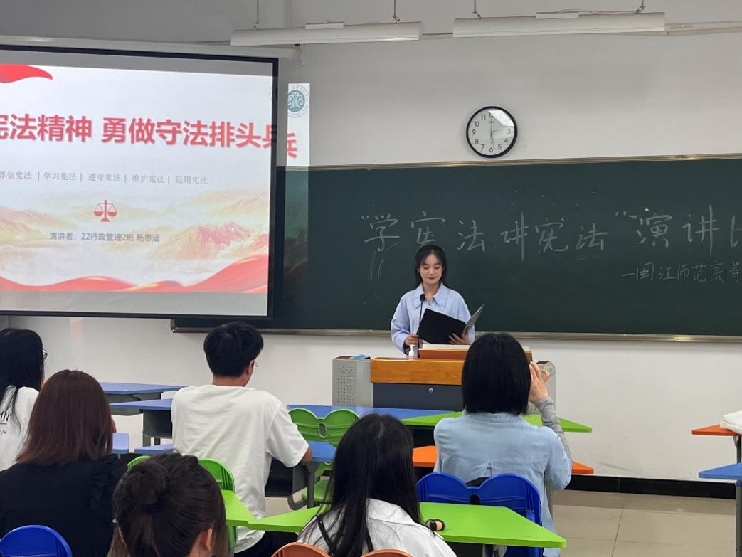 9月7日下午,宪法演讲比赛在仓山校区教学楼3-702教室拉开序幕。比赛过程中,选手们以学宪法讲宪法为主题,结合社会热点案例、自身感悟,展开激情洋溢的演讲。他们用丰富的案例和生动的语言,把宪法的深刻内涵生动地讲述给在场的每一位观众。