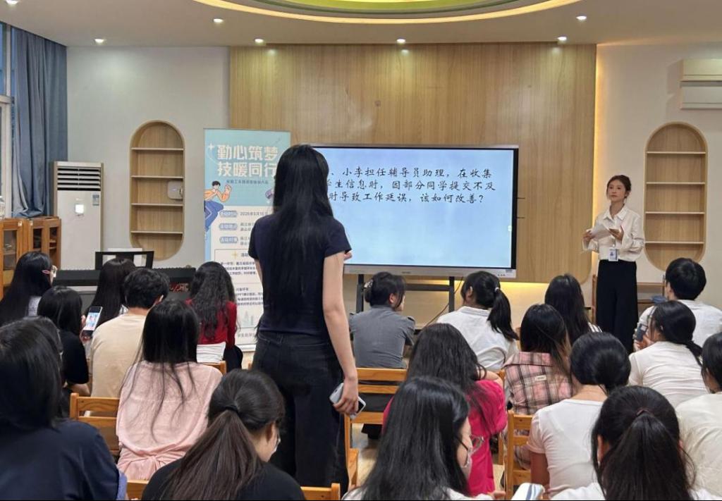 课程既涵盖具体工具使用,又注重思维模式培养,特别是“活动策划中的风险评估表”“沟通中的共情表达四步法”等内容,对同学们校内实践和未来求职均有重要意义。活动现场还设置“抢答解惑”环节,让同学们能在互动交流中凝聚成长共识。