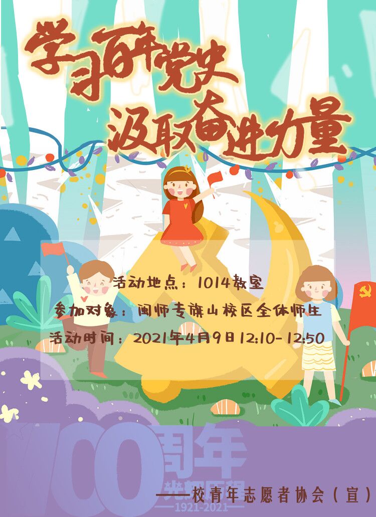 为庆祝中国共产党成立一百周年,激发同学们爱党爱国爱社会主义的精神,坚定永远跟党走的信念和决心。2021年4月9日,由大赢家体育app下载团委主办、校青年志愿者协会承办的“学习百年党史,汲取奋进力量”讲座活动在大赢家体育app下载旗山校区3015教室举行。