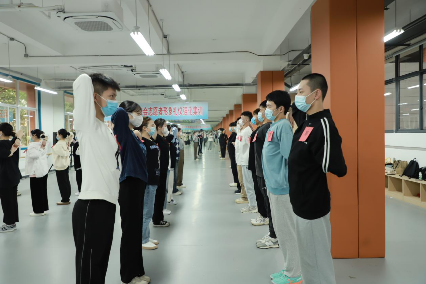 礼仪形象训练,两位礼仪老师详细介绍了基本的礼仪礼貌、接待陪同礼仪、团队形象维护以及表情礼仪等重要的礼仪知识,并分别对男女生的仪容仪表作检查和纠正,为志愿者们后续的礼仪训练打好了基础;接着是礼仪体态训练,包含站姿、蹲姿、目光、摆臂等多方面训练,两位礼仪老师根据男、女生礼仪形体的不同要求和特点,分别对男女生进行一对一的讲解与矫正,并对常用的礼仪动作加强训练,本环节的训练过后,志愿者们的礼仪体态更加标准;最后是团队配合,两位礼仪老师着重讲解了如何建立良好的人际关系和上下级关系,通过系统阐述和训练,加强了志愿者们之间的配合和默契。