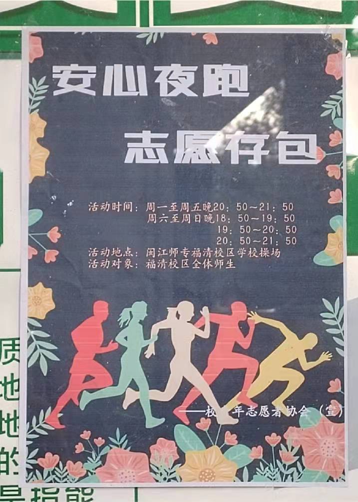 为了让广大师生能安心夜跑,以及解决夜跑同学存放物品困难的问题,闽师专青年志愿者协会与红十字会驻福清校区工作站周一至周五晚20:50到21:50、周六至周日晚18:50到21:50在福清校区操场开展了“安心夜跑,志愿存包”活动,此活动长期开展,为跑步健身的同学们提供了安全便捷的存包场所。