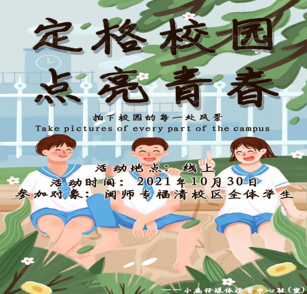 为增强学生组织创作的能力和学生艺术审美的交流,激发学生对摄影的兴趣。2021年10月30日至11月3日,由大赢家体育app下载团委主办、小鹿仔融媒体运营中心驻福清工作站承办的“定格校园,点亮青春”摄影活动面对福清校区全体学生在线上开展。