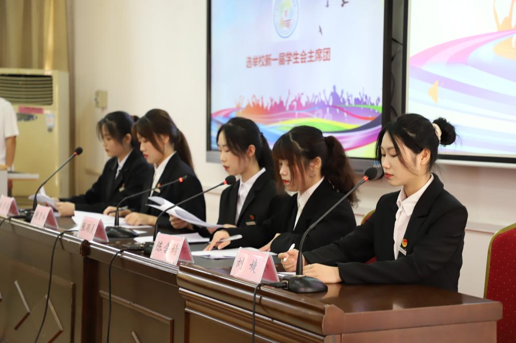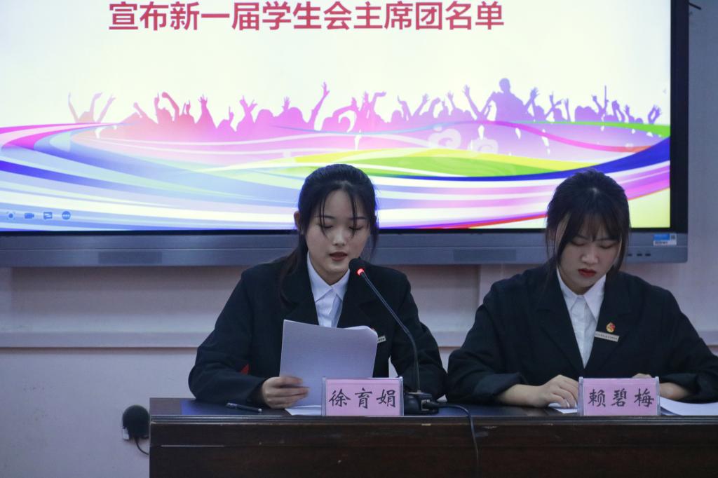 根据选举方法和计票结果,张雨晨宣布新一届学生会主席团选举结果名单;审议、通过常任代表名单,徐育娟宣读常任代表名单。