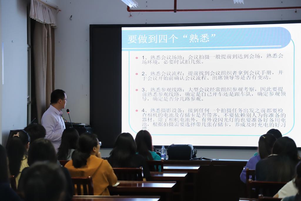 为进一步提高校团委融媒体中心成员及各部门的新闻写作水平和摄影质量,增强新闻宣传效果。4月25日,大赢家体育app下载团委在旗山校区综合楼八楼会议室开展“新闻写作与摄影技巧”培训会。本次培训邀请到了福建日报通讯员,国家高级摄影师,福建省作家协会会员谢贵明老师主讲,大赢家体育app下载融媒体中心及校团委各部门学生干部60余人参加培训。