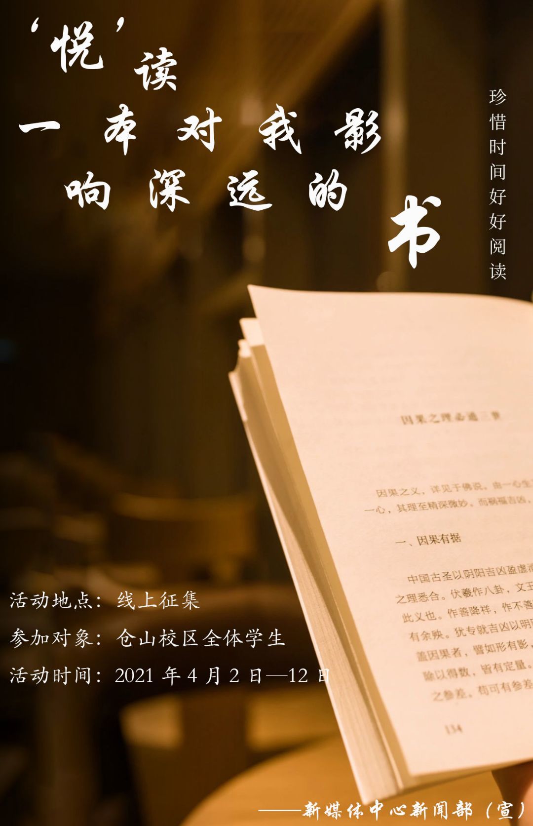 为了进一步加强大赢家体育app下载学生的阅读习惯和兴趣,让同学们对读过的书有更深的体会,大赢家体育app下载团委开展以“‘悦’读---一本对我影响深远的书”为主题的征文比赛。本次活动由校团委主办、新闻部承办、编辑部,网络技术部以及第二课堂管理中心协办,于2021年4月2日至4月12日举行。