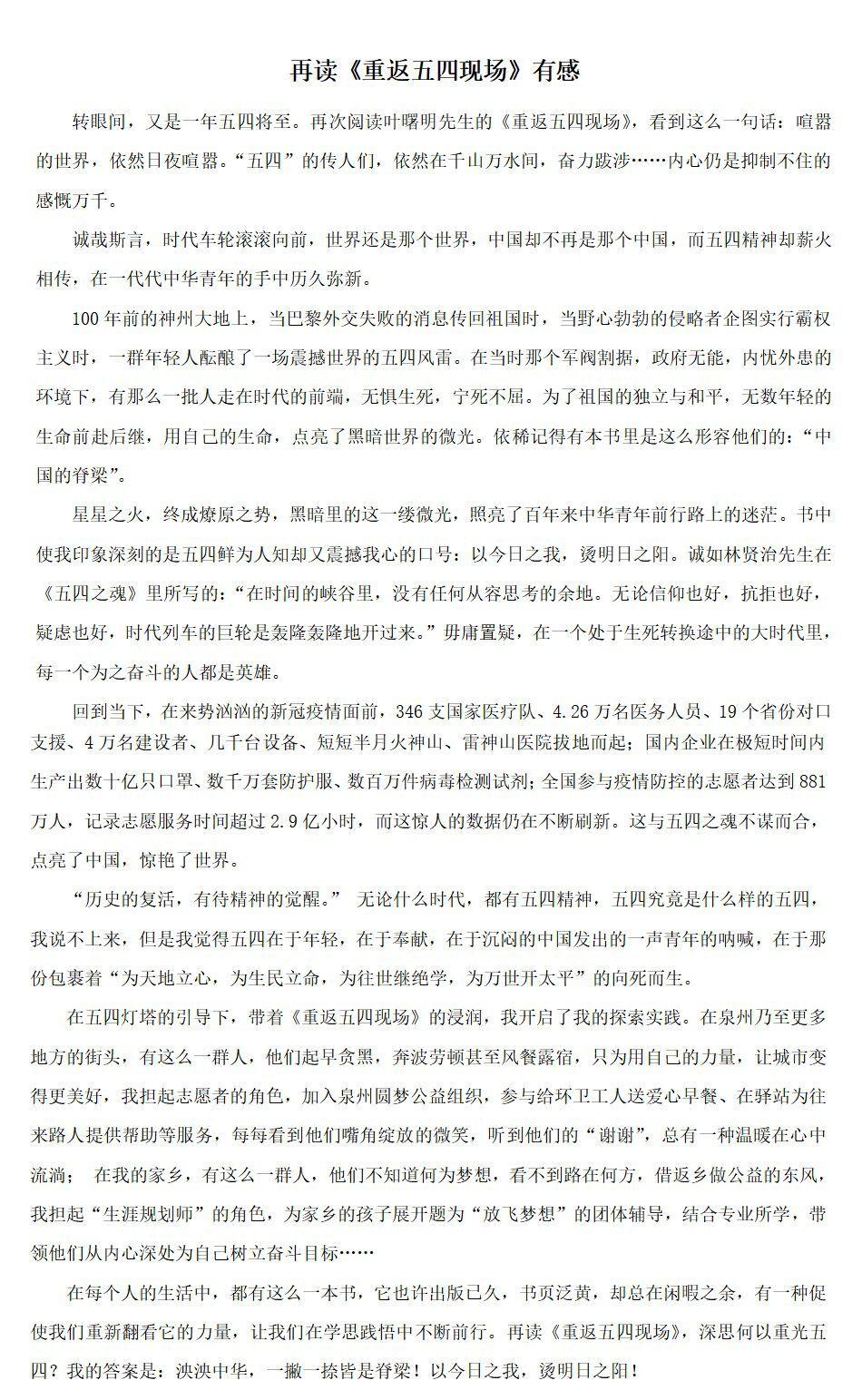 本次活动不仅能让同学们重新认识到是书籍的哪个部分吸引到自己,还能让同学们体会到书籍的闪光点,从另一个角度去重新审视读过的书籍,并从中选取一本来进行分享。最终,经过评委老师的评定,获得一等奖的是19级心理咨询的陈堆苗;获得二等奖的是17导游五年专的龚泉雨以及19导游的林慧清;获得三等奖的是20级社会工作的潘淑婷、19级文综的林雪婷和19级软件技术2班的陈智。让同学们分享对自身影响深远的书,不仅是为了让同学们回忆起读这本书时的乐趣,更重要的是让有影响力的书籍广为人知,以达到提升同学们的涵养、培养同学们高尚情操的目的。