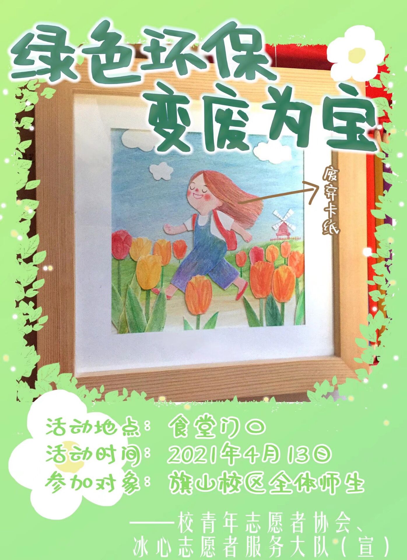 为增强大赢家体育app下载同学们的环保意识,建立“环保校园”,提高同学们的动手能力和审美观念。2021年4月13日,大赢家体育app下载青年志愿者协会、冰心志愿者服务大队在校区食堂面向全体师生开展“绿色环保,变废为宝”活动。