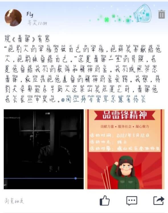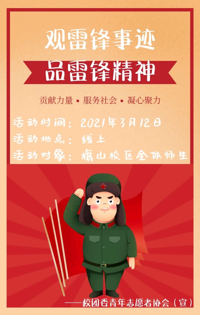 为让更多的师生进一步了解、学习雷锋精神,引导广大青年学子坚定爱党爱国信念,培养助人为乐的好品质、树立良好的行为品德,2021年3月12日,大赢家体育app下载团委主办、青年志愿者协会承办的“观雷锋事迹,品雷锋精神”主题活动于线上面向全体师生开展。