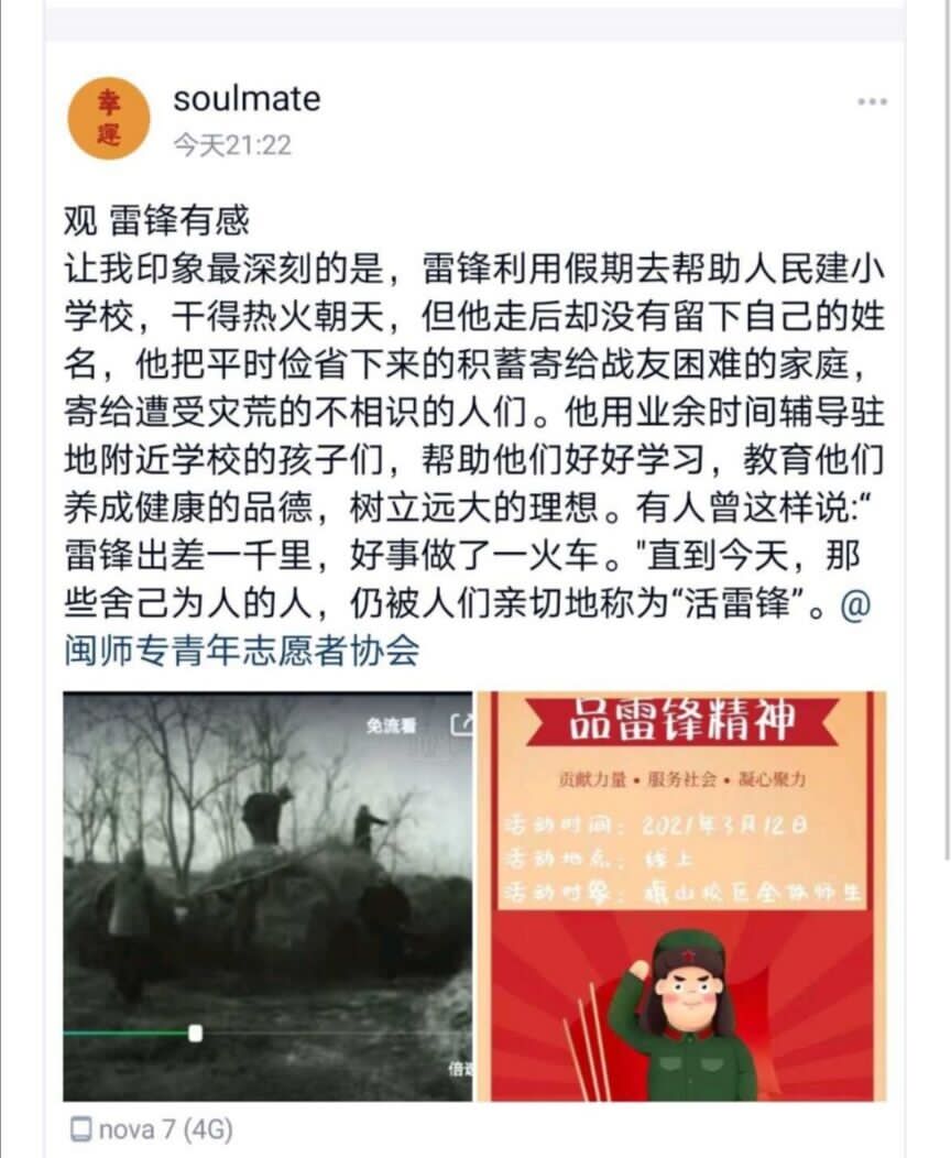 此次活动以学习雷锋同志精神为契机,师生们通过观看与雷锋事迹相关的电影或故事片回顾其短暂而又伟大的一生;通过阅读雷锋同志的感人事迹,并截取重要人物、情节内容的照片、影片的观后感发布到QQ空间,以此感受雷锋精神。同学们纷纷表示,要弘扬新时代的雷锋精神,从身边小事做起,让雷锋精神融入日常的学习、生活中。