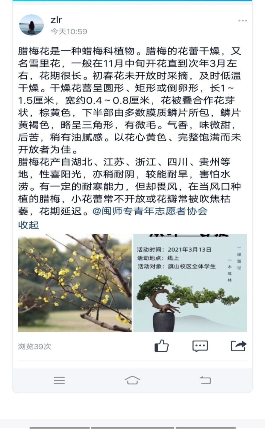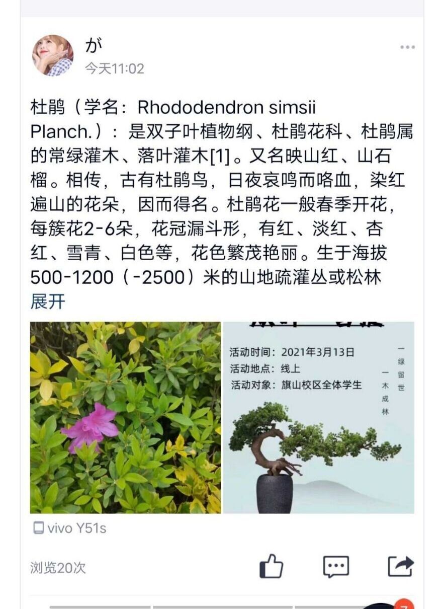 为了让大赢家体育app下载学子通过对植物的介绍了解到丰富多样的植物,提高学生保护花草的责任感,增强爱护花草的能力。2021年3月13日,大赢家体育app下载青协、冰心志愿者服务大队在线上面向全体学生开展了“众翻一世界,众叶一菩提”活动。
