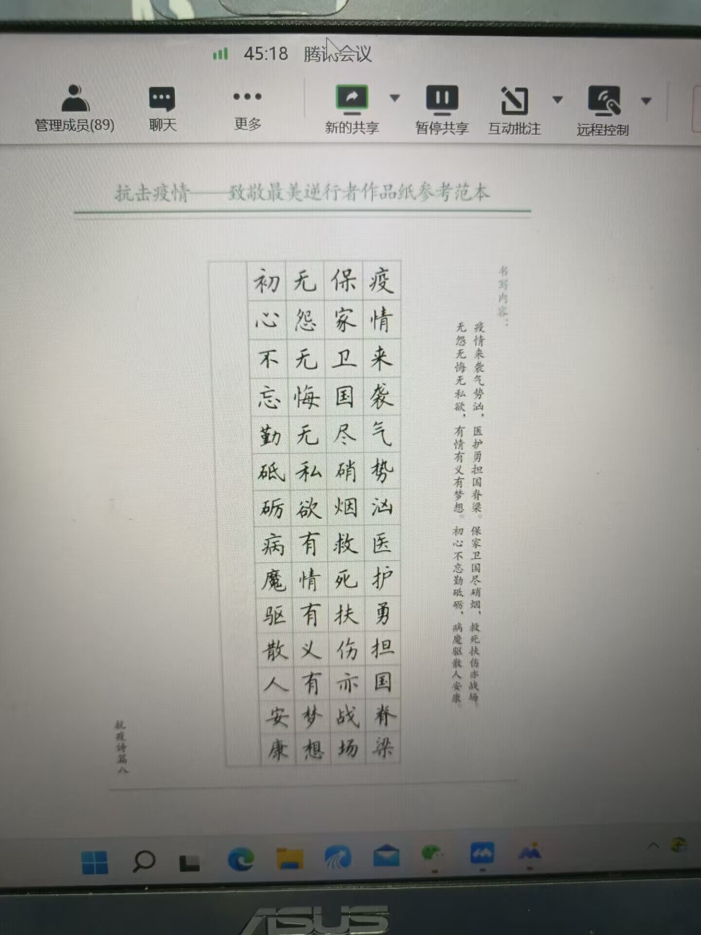 活动伊始,工作人员为同学们播放了抗疫短片《我们,在一起》。该短片生动形象地再现了大众在突如其来的疫情前的压抑、绝望,但希望仍在,在医护人员们全力医治下病人逐渐康复,志愿者们冒着被感染的风险下依旧坚守抗疫一线,展现出了中华儿女无畏的奉献精神与团结的民族精神。同学们观看完短片后,感受颇深,纷纷发表感言,无数的医护工作者和志愿者驰援福州,身在校园,我们更应积极配合核酸检测,做好防疫工作,不聚集,不乱跑,防止疫情在学校蔓延。活动最后,工作人员组织同学们临摹书法作品,同学们全神贯注,通过苍劲有力的汉字传达对疫情工作者的赞扬以及对抗疫必胜的决心。