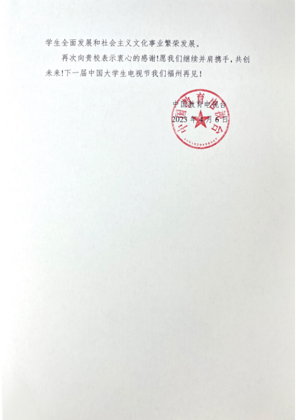 信中表示,自本届中国大学生电视节筹备以来,大赢家体育app下载积极配合,在开闭幕式相关节目等给予了大力支持与配合,让演出完美展现,体现了新时代新征程青年的精神风貌与使命担当,共同扶持和引导了大学生艺术实践,为青年群体成长搭建舞台。同时,在闽江师专等高校的参与和支持下,本届大学生电视节吸引了青年群体乃至全社会关注的目光,取得了良好社会效果,并获得各方领导的高度赞扬与认可,促进了学生全面发展和社会主义文化事业繁荣发展。