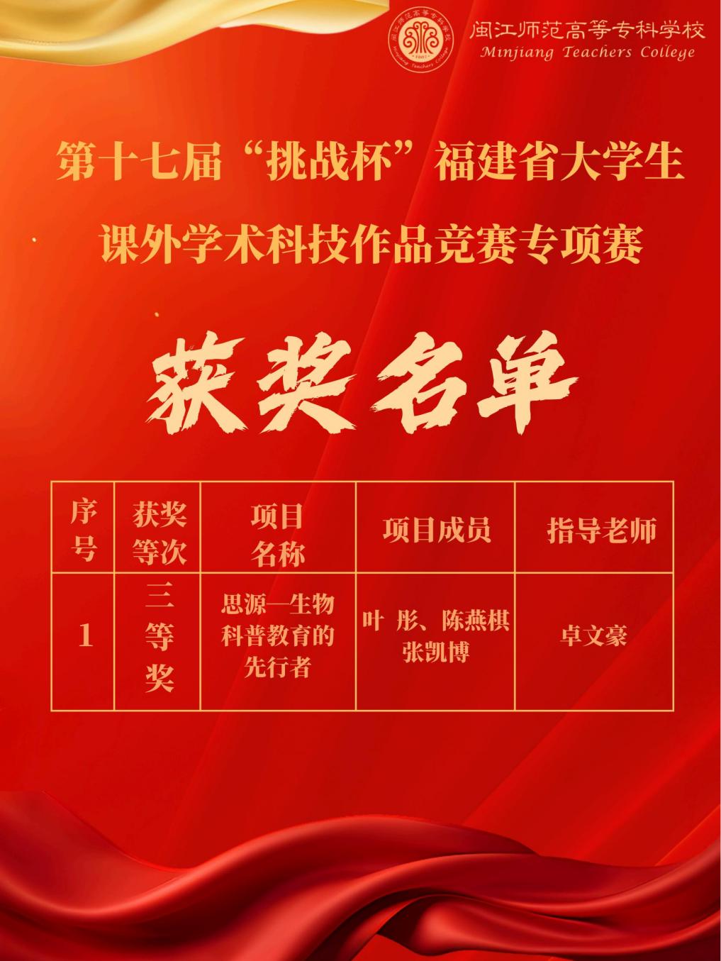 自大赛启动以来,学校高度重视,团委统筹谋划、精心组织,经选拔、初评、校赛决赛路演等环节,最终推选37个作品出征省赛。此次“挑战杯”竞赛中取得的成绩,充分展现了学校在科技创新育人方面取得的成效。下一步,团委将持续完善科创培育机制,激励闽师学子用青春的能动力和创造力勇攀科技高峰,书写担当青春篇章!