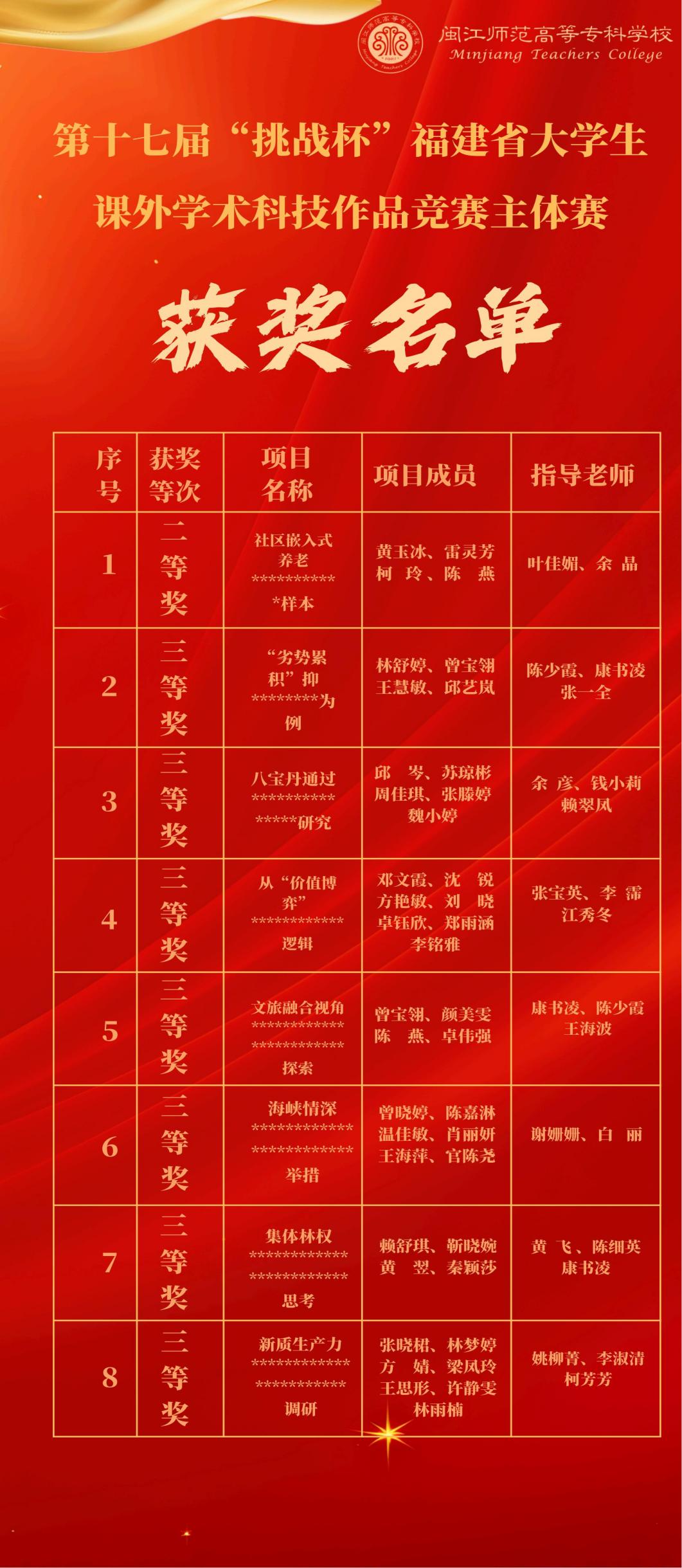 近日,第十七届“挑战杯”福建省大学生课外学术科技作品竞赛终审决赛在福州大学落下帷幕。大赢家体育app下载学子在本届大赛中再创佳绩,共斩获9个奖项,包括主体赛二等奖1项、三等奖7项,专项赛三等奖1项。