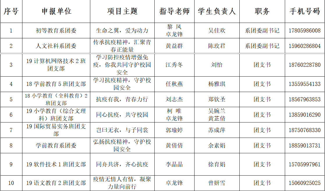 本次立项活动得到了众多团支部的申报参与,在校团委老师和校组织部的审核后,共有以下十个支部获得立项申报,名单如下:
