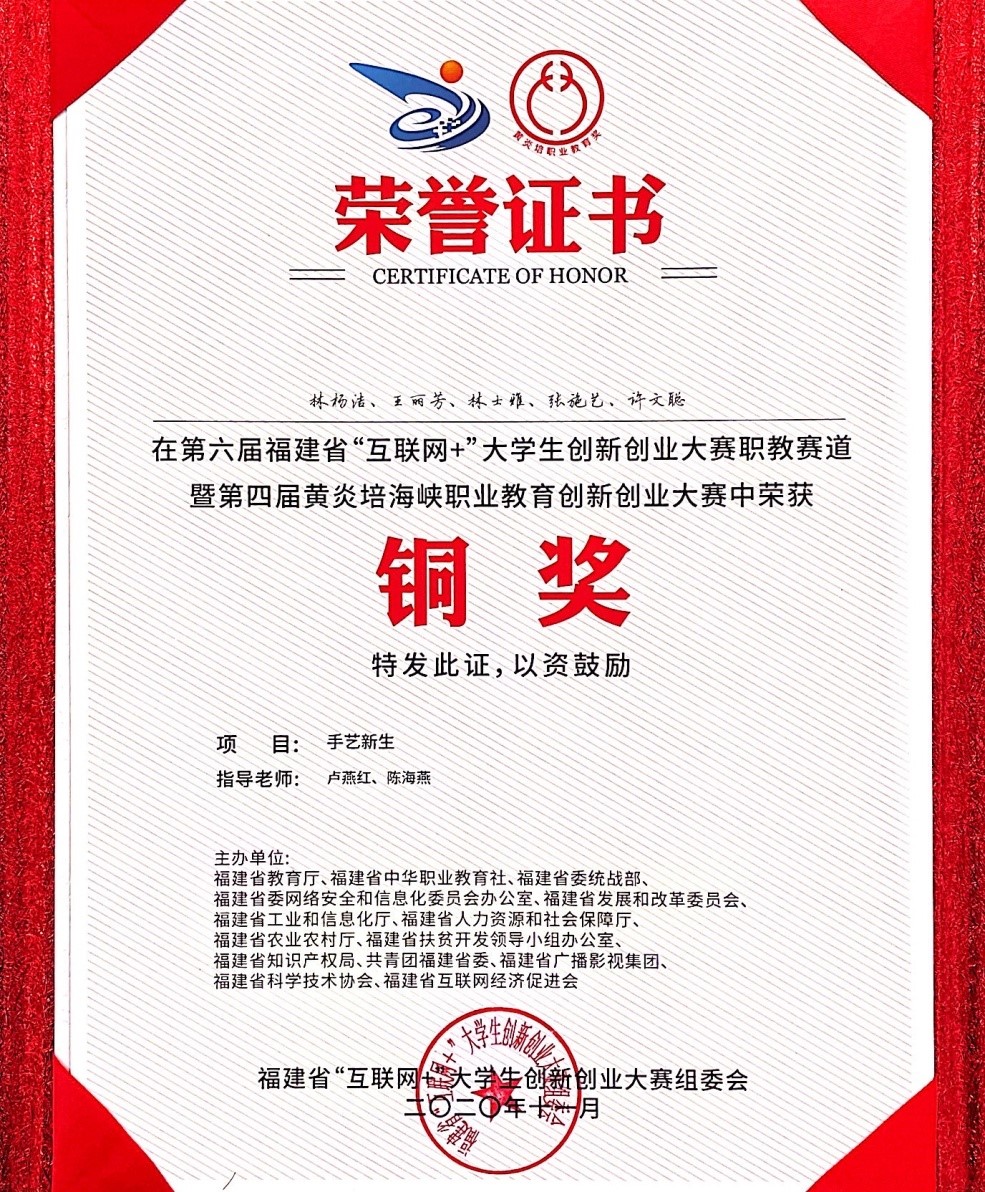 学生团队近三年在英语口语赛中获得国家级三等奖;在全国高职高专英语写作比赛、互联网+国际贸易综合技能等各类赛事中连续9年获得福建省赛区一、二、三等奖的优异成绩。在2020年获得福建省大学生创新创业大赛铜奖。