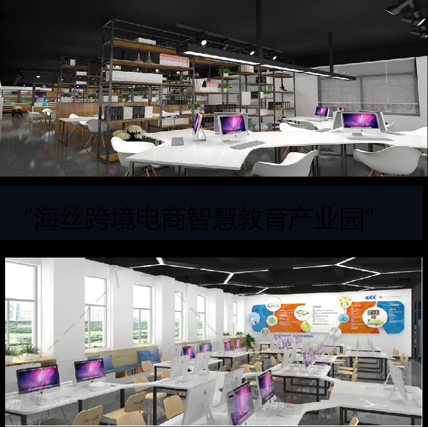 目前正在建设的“海丝”跨境电子商务智慧(教育)产业园有2000平米,包含跨境电商综合运营实训室、新媒体运营工作室、商务数据分析室等七大功能模块。同时购买4套进出口业务操作系统软件、1套POCIB国际贸易从业综合实训软件、1套跨境电商模拟操作软件和1套网店运营推广软件、1套网络营销软件,能够完全支撑教学、实训所需。