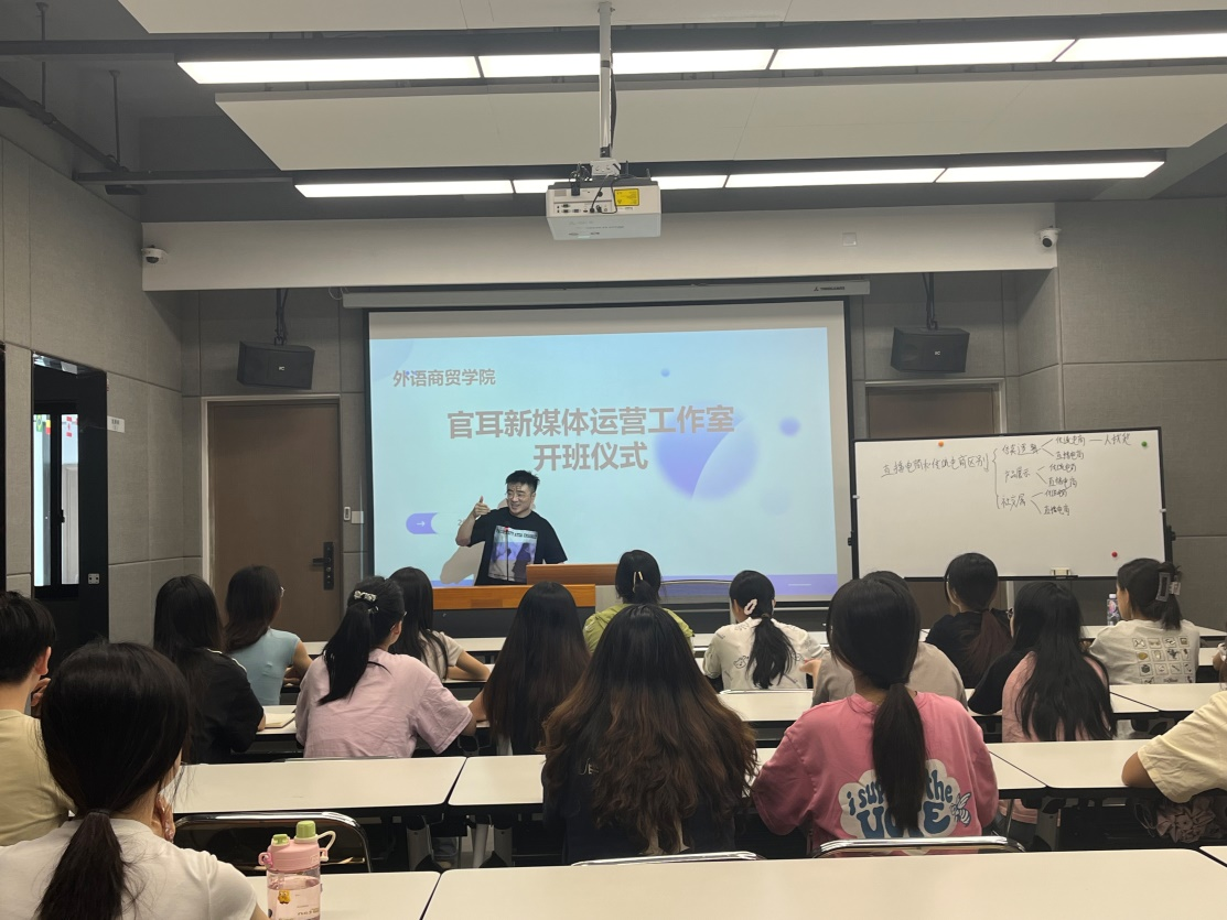 2024年8月26日,外语商贸学院与福州官耳生物科技有限公司共同举办的“官耳新媒体运营工作室”在产创楼E304顺利开班。外语商贸学院院长何少娴、副院长陈海燕、福州官耳生物科技有限公司翁赋冬总经理、人事主管郑佳、校内班主任郑美玲、企业负责人陈伟豪、吴发燏以及参与工作室的19名学生共同参加本次开班仪式。
