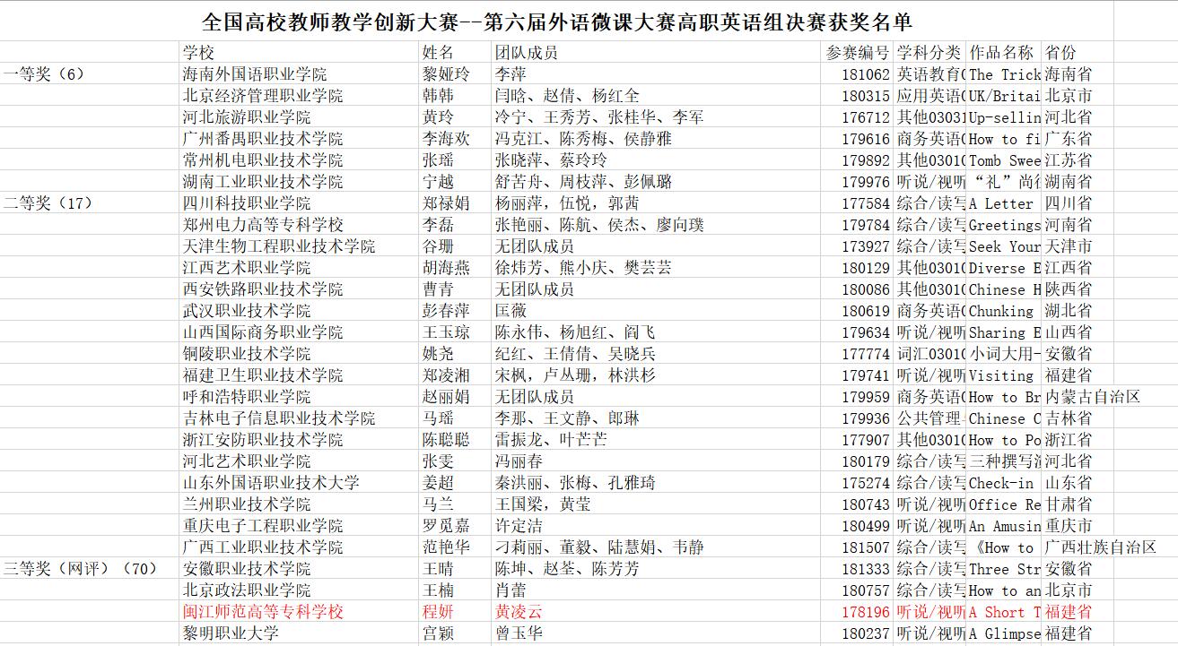在刚刚公布的“全国高校教师教学创新大赛——第六届外语微课大赛”全国决赛的结果中,由外语系程妍老师和黄凌云老师组成的教学团队荣获高职组三等奖的佳绩。