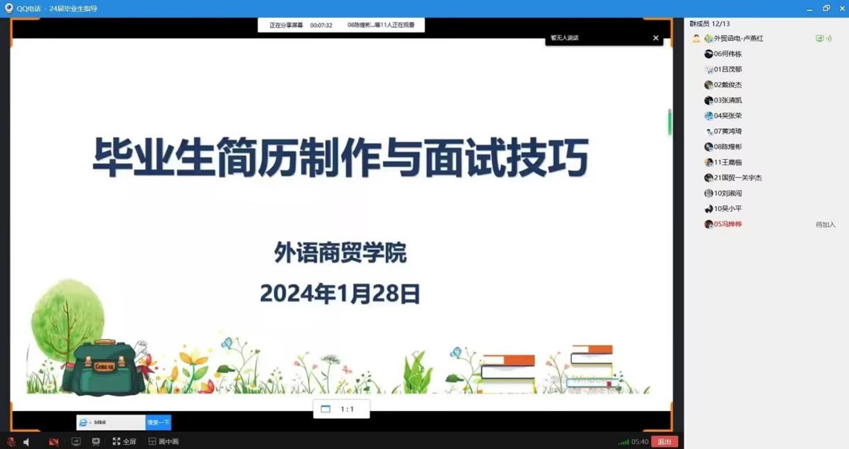 为贯彻落实教育部《关于开展“寒假促就业暖心行动”的通知》要求,充分利用寒假窗口期,持续指导帮扶学生就业,外语商贸学院全体专任教师针对2024届毕业生开展了简历制作和面试技巧指导活动。