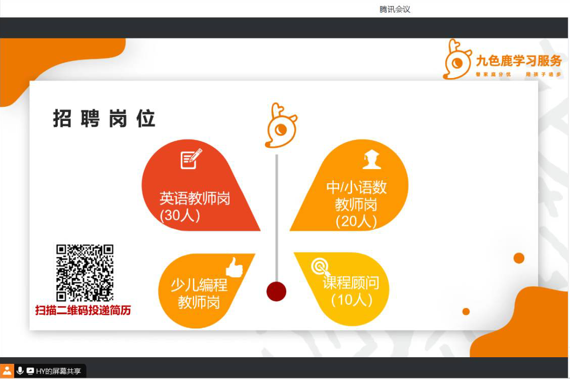 此次线上招聘会,九色鹿培训学校为同学们提供了包括英语教师、语文教师、课程顾问在内的近60个岗位,同时,专为我院学生需求,进行个性化招聘模式。我院共46人线上参会,并根据自己的求职意向,在会后进行简历投递,为下一步的线上面试做好准备。