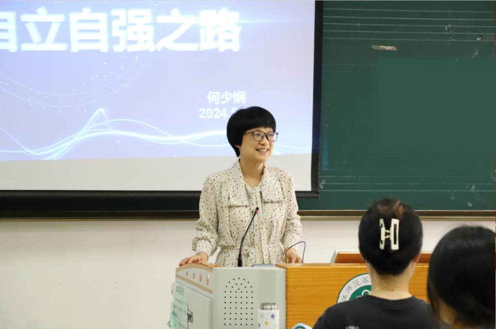 2024年5月29日下午18:30,外语商贸学院院长何少娴在旗山校区3003教室开展形势与政策课,主题为:走好新时代科技自立自强之路,22级跨境电子商务班全体学生参加。