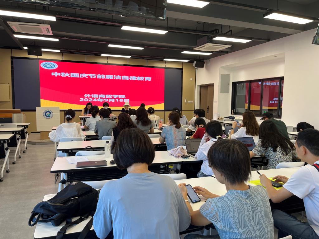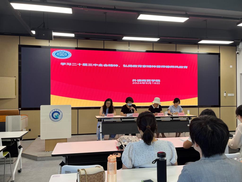 2024年9月18日下午,外语商贸学院在产创楼307多功能报告厅举行了例行会议。学院党总支书记林锦芯、院长何少娴、副院长陈海燕、副院长刘诗雨以及全体教职工出席了会议。会议由何少娴院长主持。