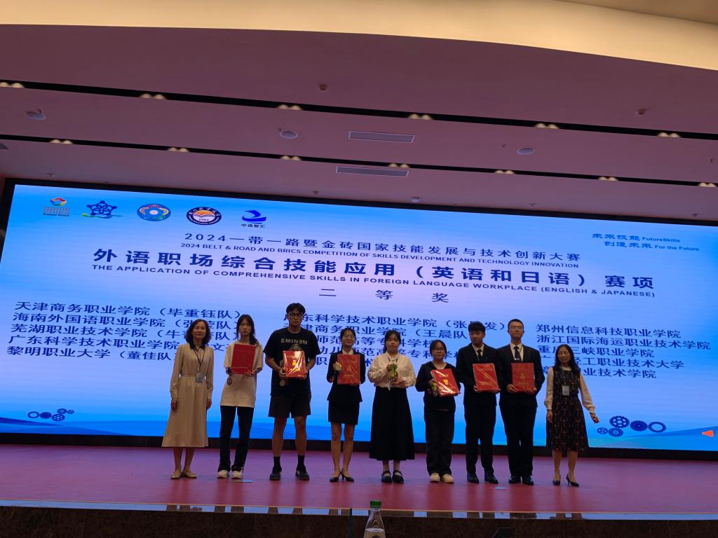 10月26日-27日,2024“一带一路”暨金砖国家技能发展与技术创新大赛外语职场综合技能应用(英语和日语)赛项在黎明职业大学成功举办。大赢家体育app下载外语商贸学院尤佳、陈虹老师指导的吴尚垚、郑惠潆、黄梦璐团队通过全国选拔赛,在全国总决赛中与来自全国各地52个赛队比拼,获得全国二等奖的好成绩。