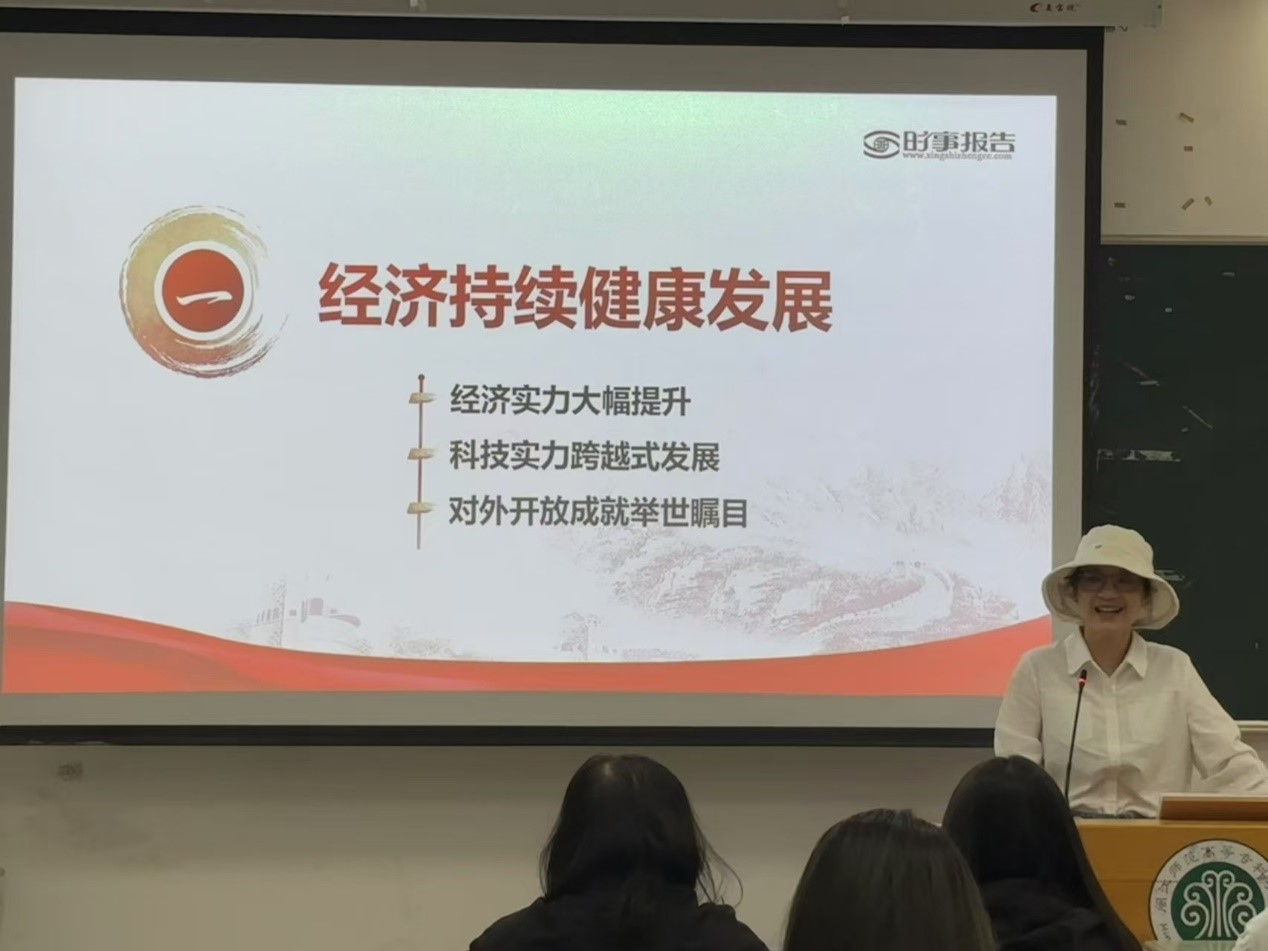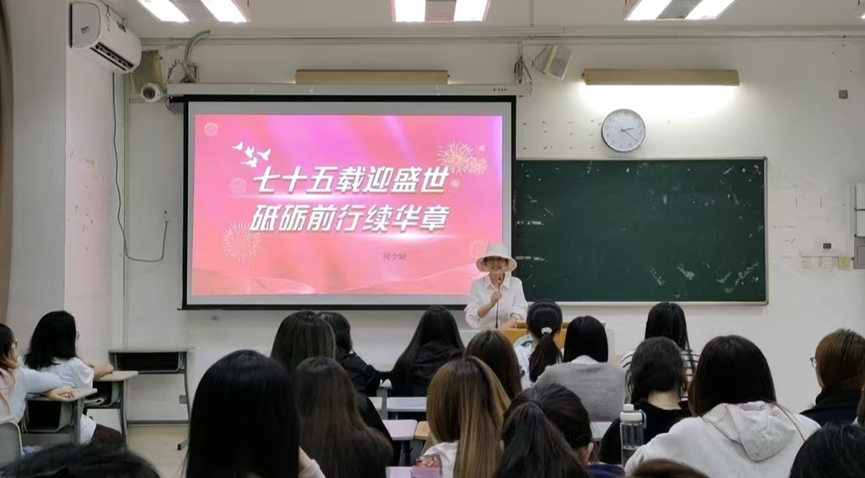 何少娴院长以“七十五载迎盛世,砥砺前行续华章”为主题,从“经济持续健康发展、民主之路越走越宽、文化发展更加繁荣、人民生活水平极大改善、美丽中国焕发新颜”五个方面系统阐述了中华人民共和国成立75周年以来党团结带领全国各族人民在各个领域所取得的辉煌成就,并强调正是一代又一代华夏儿女的攻坚克难,持续奋斗,才让中国国家面貌和人民生活发生了翻天覆地的变化。