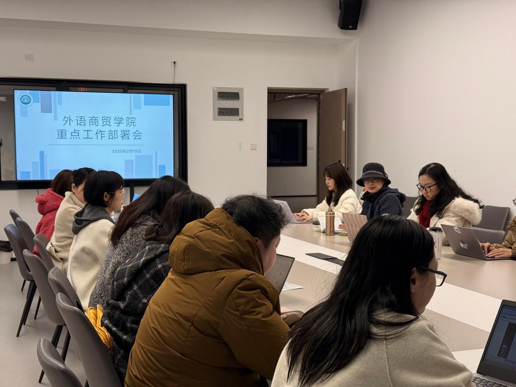 为深入学习贯彻学校第一次党代会精神,谋划部署新学期重点工作,近日,外语商贸学院于产创楼303召开新学期重点工作部署会。外语商贸学院何少娴院长、陈海燕、刘诗雨副院长及各教研室主任、骨干教师参加会议。会议由何少娴院长主持。