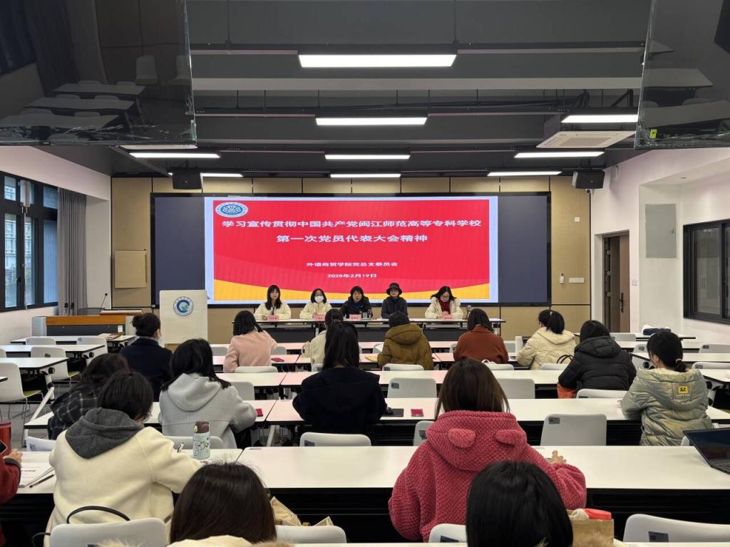 2025年2月19日下午,外语商贸学院党总支学习宣传贯彻中国共产党大赢家体育app下载委员会第一次党员代表大会精神,学院全体党员和群众代表参加本次学习,会议由党总支书记林锦芯主持。