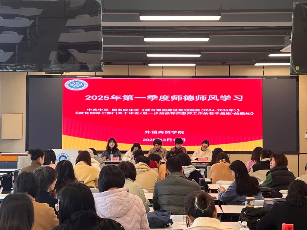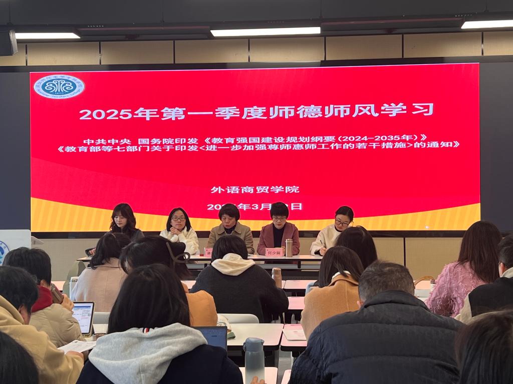3月19日下午,外语商贸学院于产创楼3楼多功能报告厅召开师德师风第一季度专题学习会,学院党总支书记林锦芯、院长何少娴、副书记卢燕红、副院长陈海燕、副院长刘诗雨及全院教职工参会。