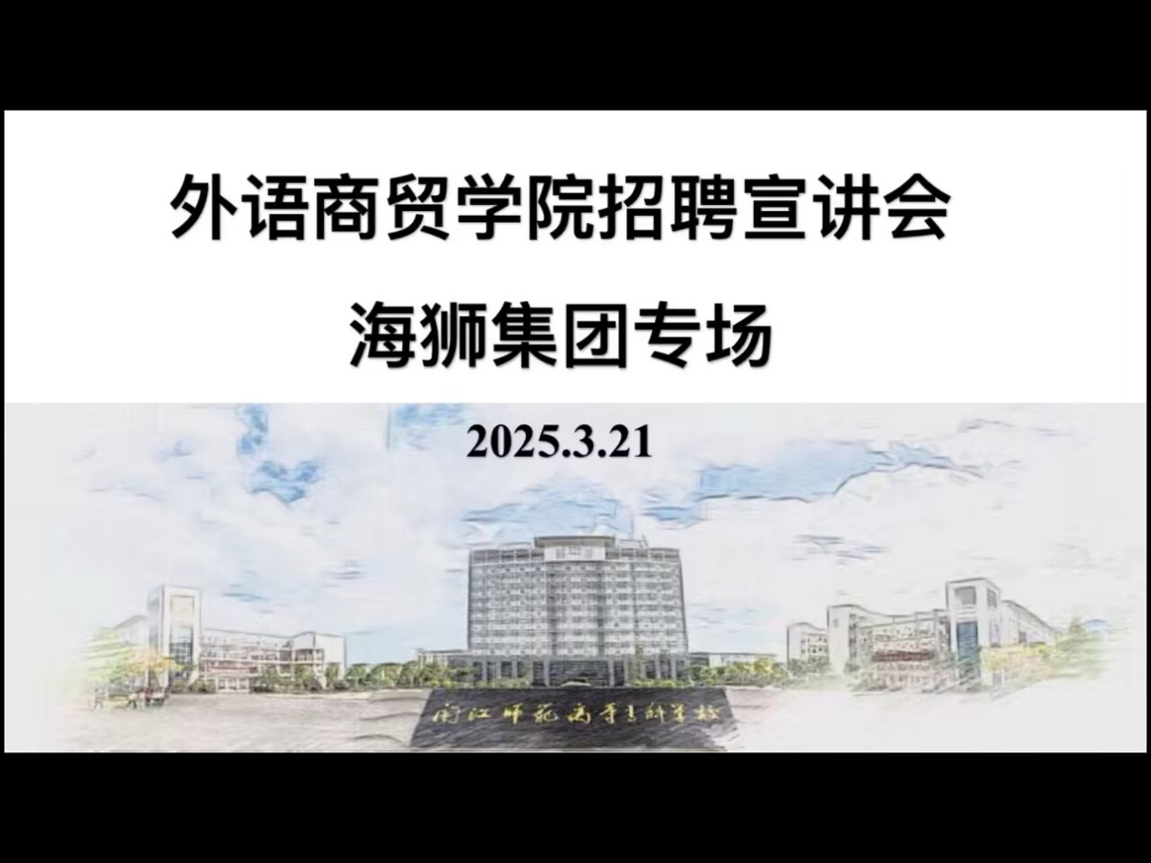 为深化校企合作,推进2025届毕业生就业工作,外语商贸学院于2025年3月21日下午15:00在2013教室线上线下同步开展海狮集团招聘宣讲会。此次宣讲会旨在为公司吸纳优秀人才,充实人才队伍,助力公司战略目标的实现,同时也为广大求职者提供广阔的职业发展平台。