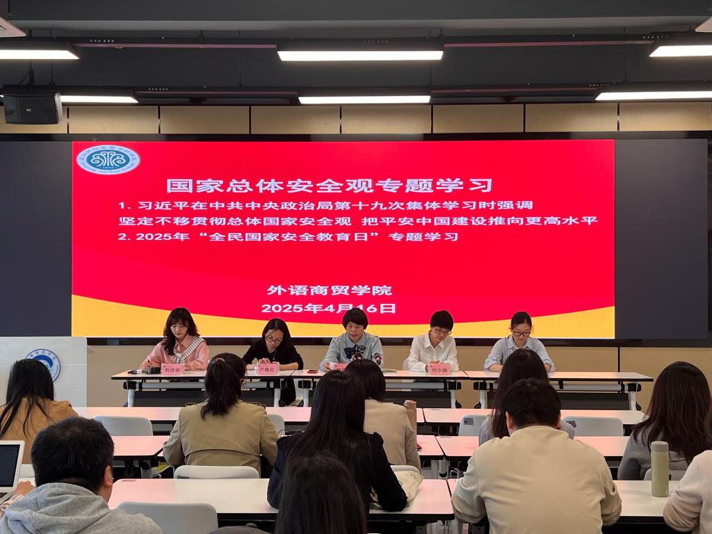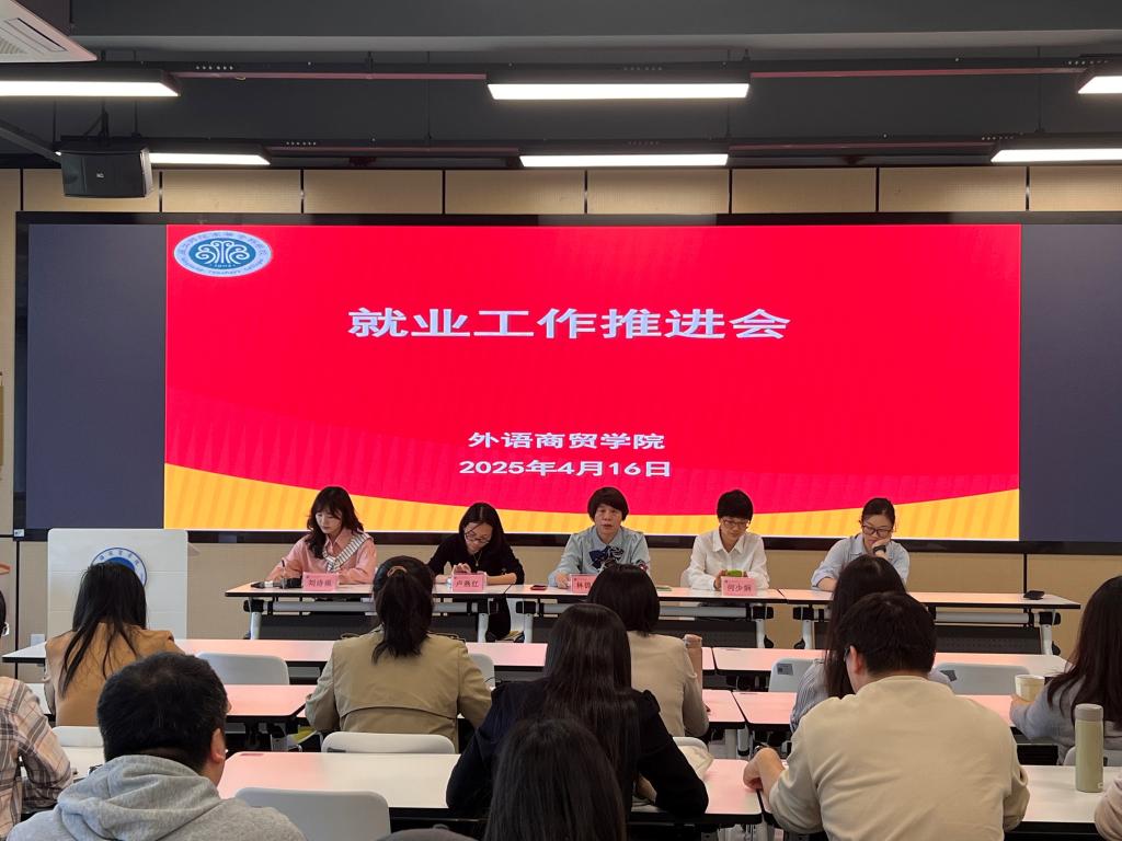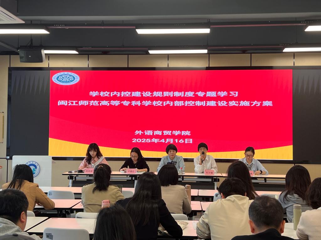 2025年4月16日下午,外语商贸学院于产创楼307多功能报告厅召开全院教职工会议。学院党总支书记林锦芯、院长何少娴、副书记卢燕红、副院长陈海燕、副院长刘诗雨及全体教职工参会。会议由刘诗雨副院长主持。