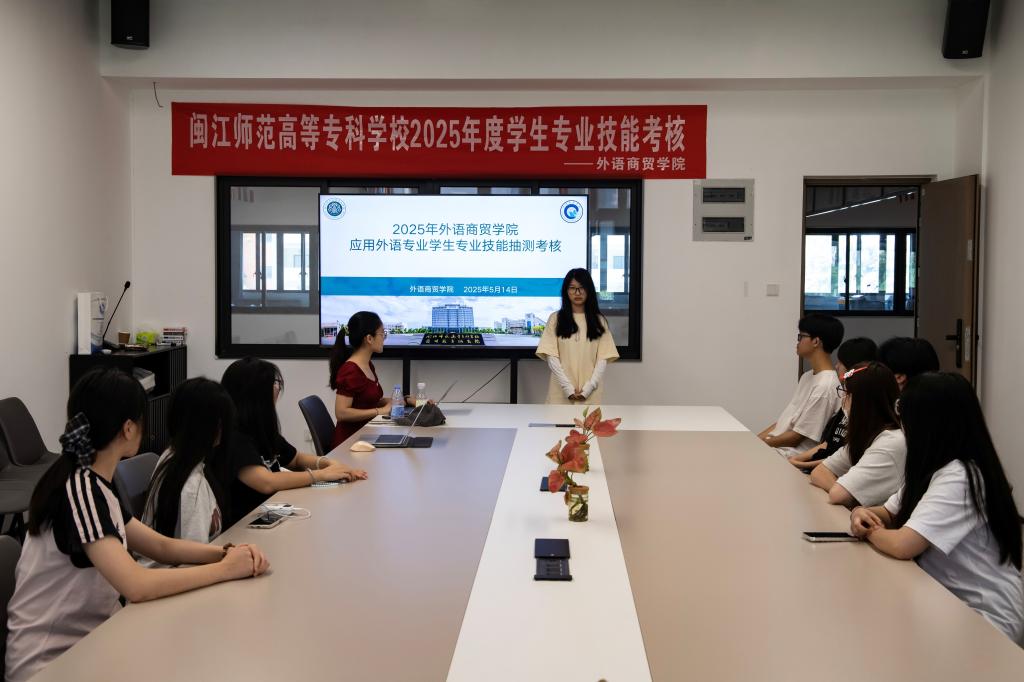 本次考核面向小学英语教育、应用英语(含2024级五年专学生)、应用外语(柬埔寨语、马来语方向)、国际经济与贸易、跨境电子商务五个专业。由教务处随机抽取40名学生,按照各专业技能抽测方案,完成专业基本技能、岗位核心技能、跨岗位综合技能三个模块的考核。专业考核由骨干教师担任评委,并对考核表现做点评。此次考核还增设观摩环节,共吸引了60余名师生到场学习。考核结果显示,各专业考核通过率达100%,充分展现学生扎实的专业功底和良好的专业素养。