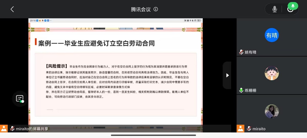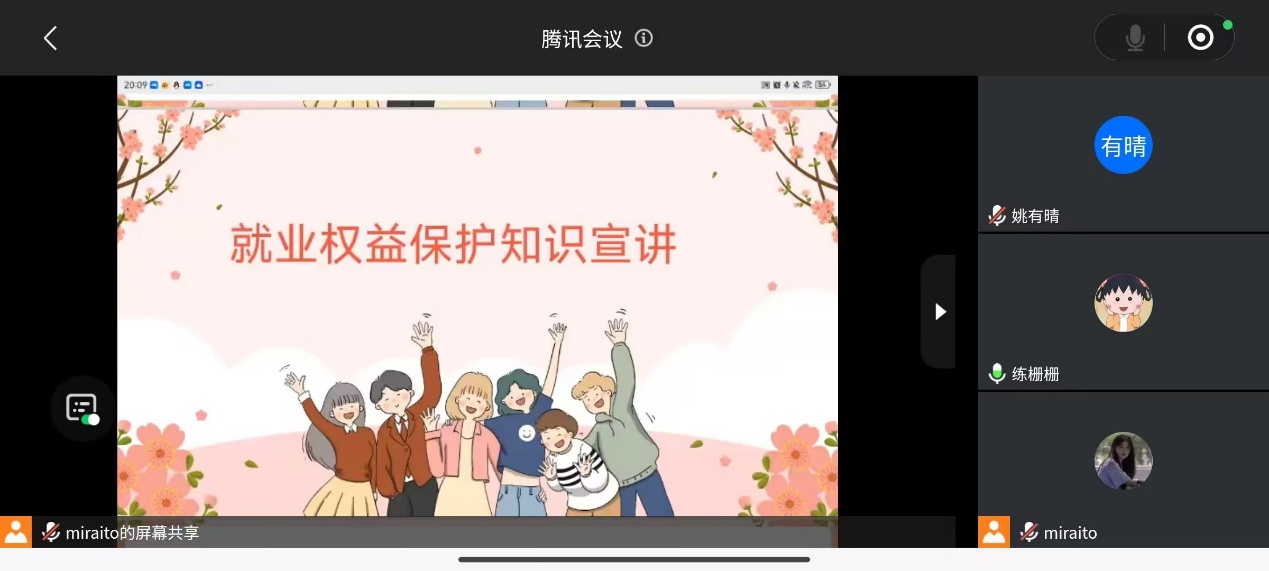 为积极响应国家关于毕业生就业创业的号召,提升同学们在求职就业过程中的法律风险识别和防范能力,助力毕业班学生顺利过渡到职场阶段,外语商贸学院于5月18日晚上开展毕业班就业权益保护知识主题教育活动。
