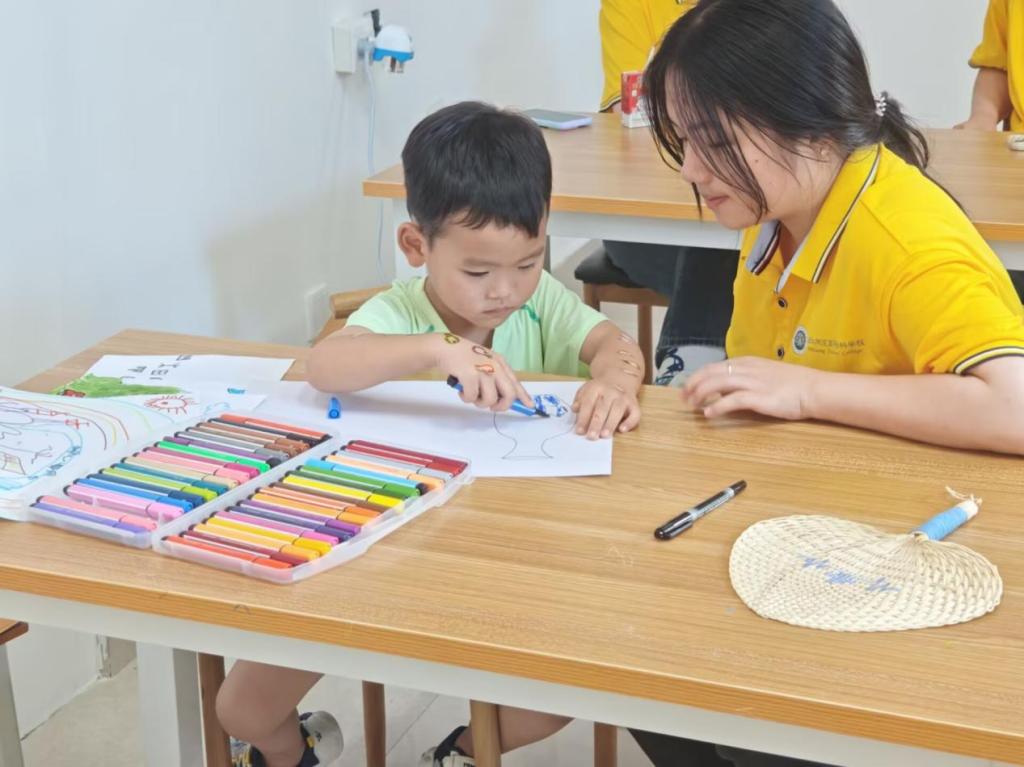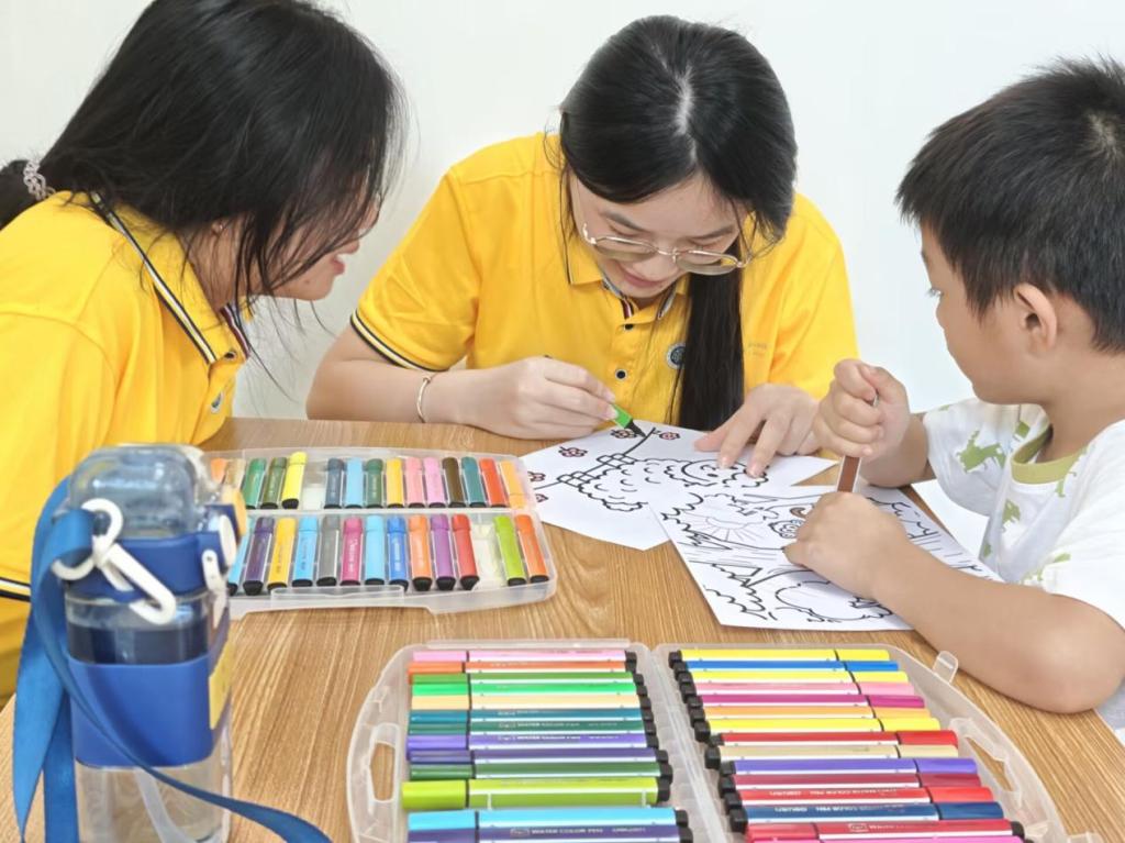 志愿者从字母教学切入,搭配色彩明艳的颜色卡片,让孩子们化身“色彩侦探”猜测对应英语。再借手工创作、涂色游戏,把单调认读变成趣味冒险,引导孩子在动手涂色、大声认读间,稳稳筑牢英语学习的第一块基石。