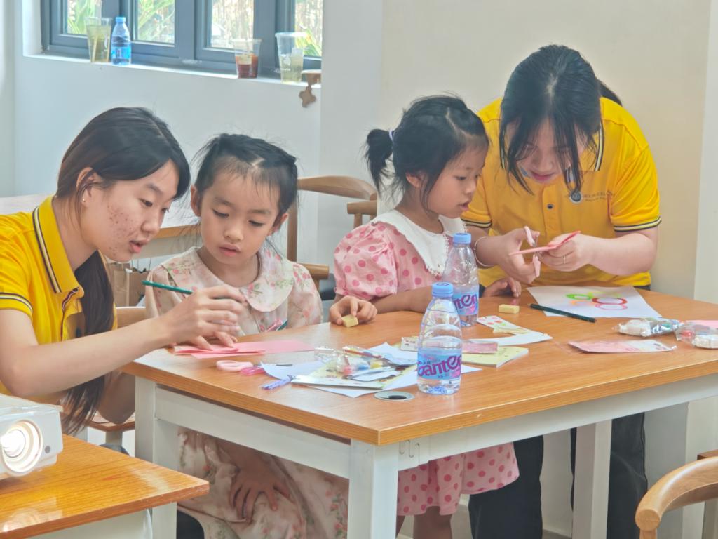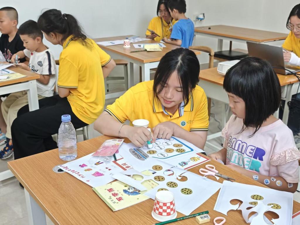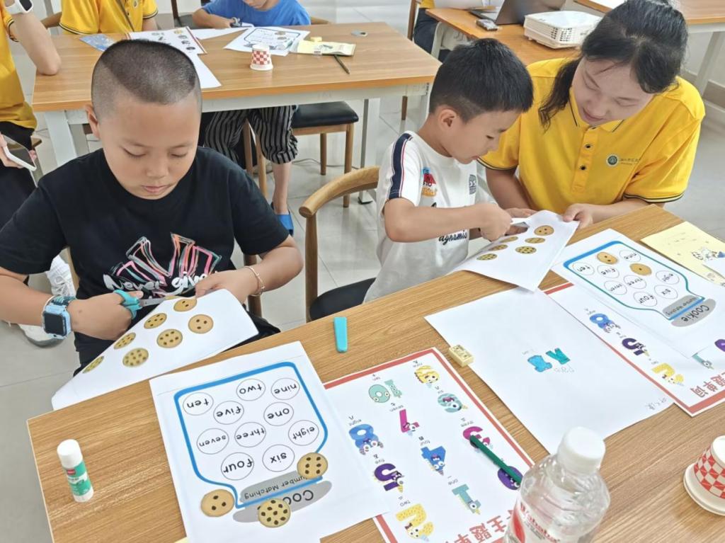 志愿者围绕数字英语单词,巧思设计数字饼干配对、数杯子游戏。孩子们在玩乐中,借实物操作触摸数字概念,靠互动竞赛激发好胜心,轻松将数字单词纳入知识宝库,让学习像游戏闯关般上瘾。