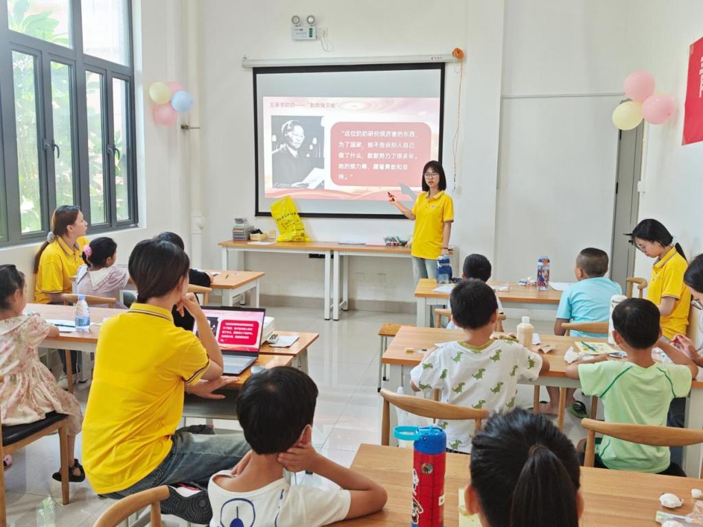 志愿者讲述党的光辉历程,以红色故事串联爱国精神传承。组织“从伟人到身边的人,每个人都是爱的接力棒”讨论,带领孩子们制作爱国书签,让红色基因悄然浸润心灵。