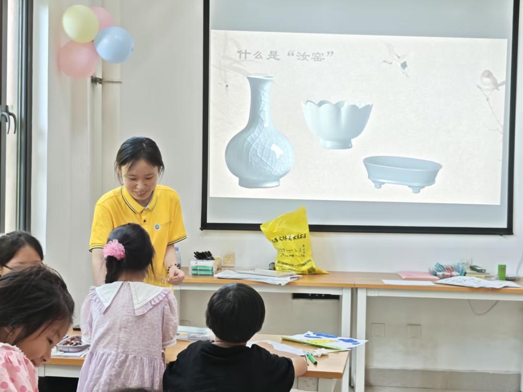 志愿者细讲汝窑历史与工艺,借提花网、水彩颜料,带孩子们“复刻”汝窑魅力。指导制作拼贴画时,孩子们捏陶土、绘纹路,在动手实践里,触摸千年非遗的温度,让古老汝窑文化,在童真创作中鲜活传承。