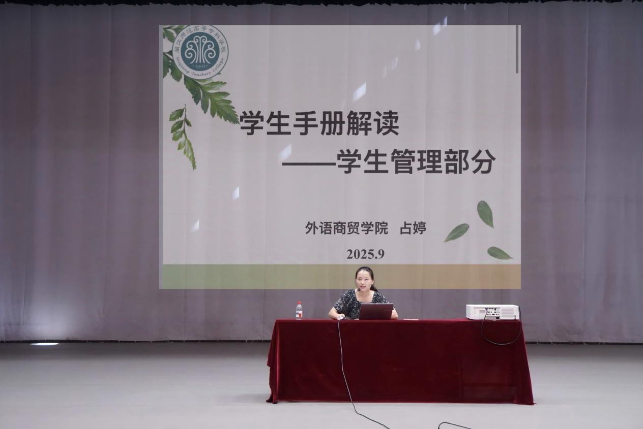 9月9日下午,外语商贸学院在旗山学术报告厅为2025级新生开展党团教育、学风与校纪校规教育、劳动教育等入学教育活动。2025级全体新生参加。