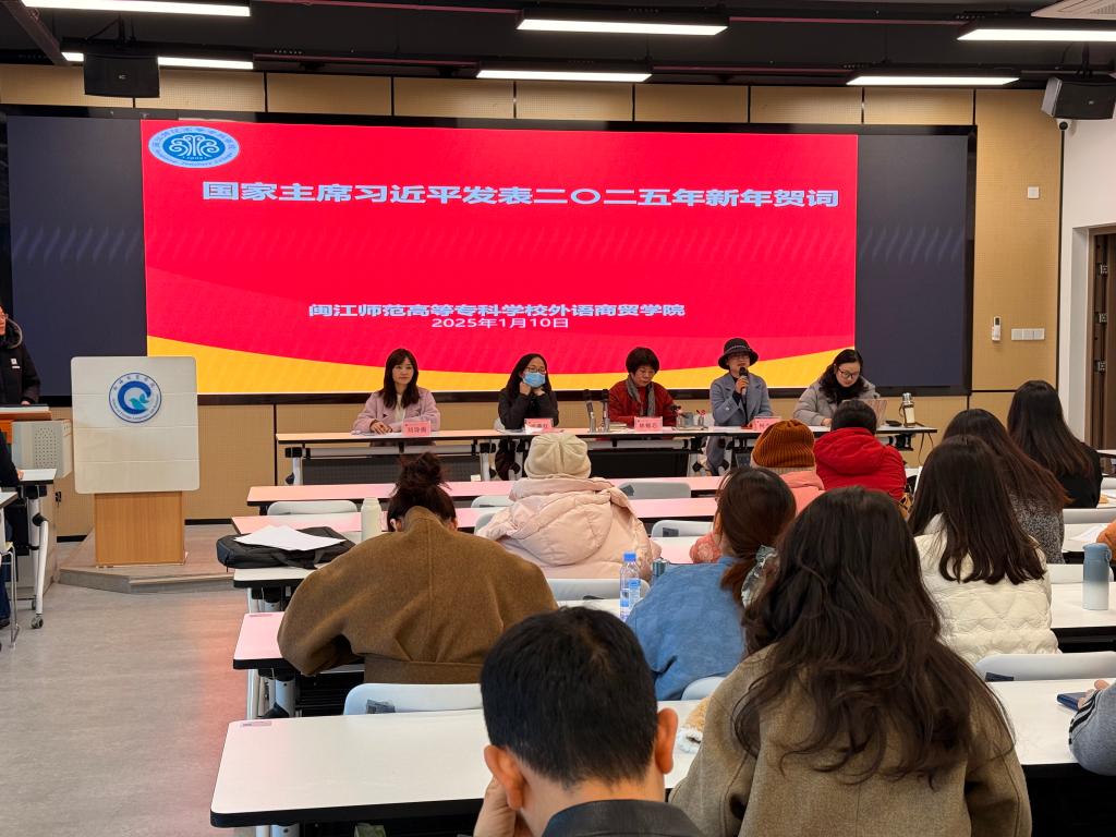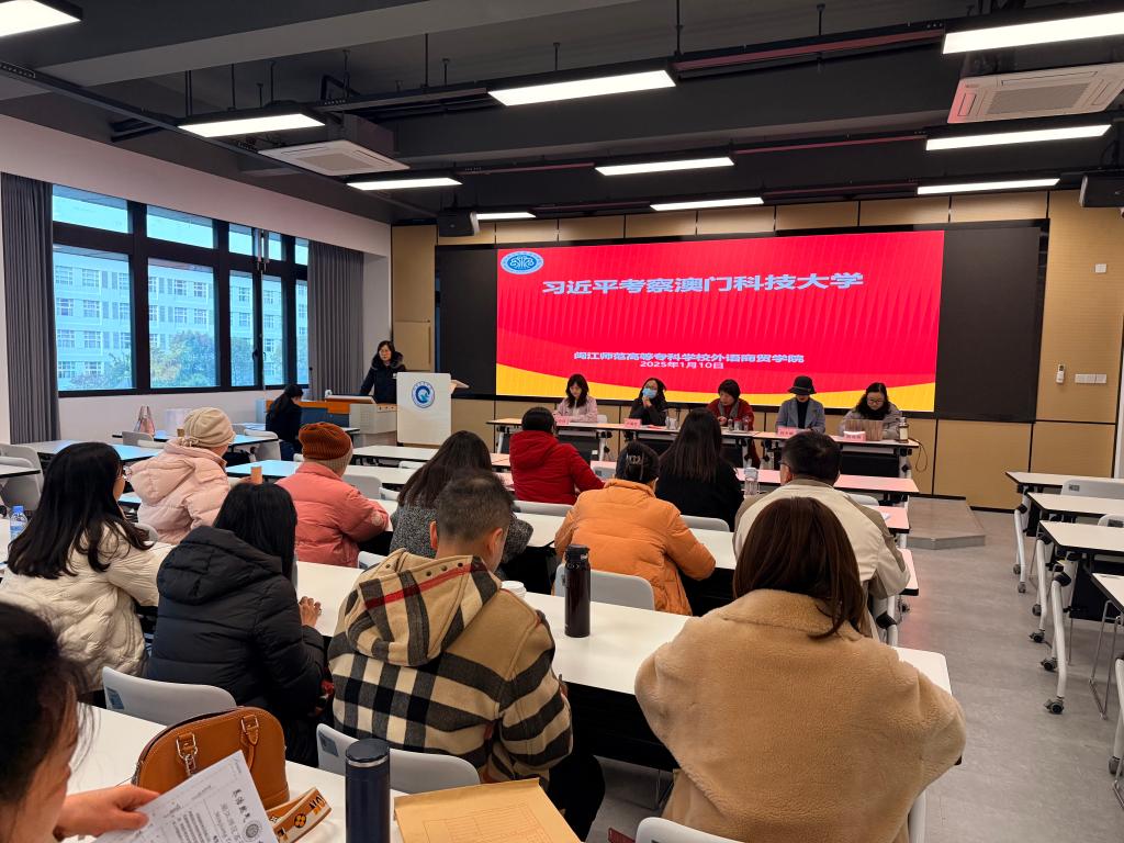2025 年 1 月 10 日下午,外语商贸学院在产创楼 307 多功能报告厅召开学院全体教职工会议。学院党总支书记林锦芯、院长何少娴、副书记卢燕红、副院长陈海燕、副院长刘诗雨及全体教职工参会。会议由刘诗雨副院长主持。