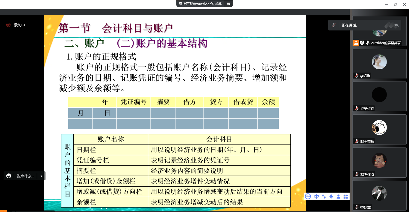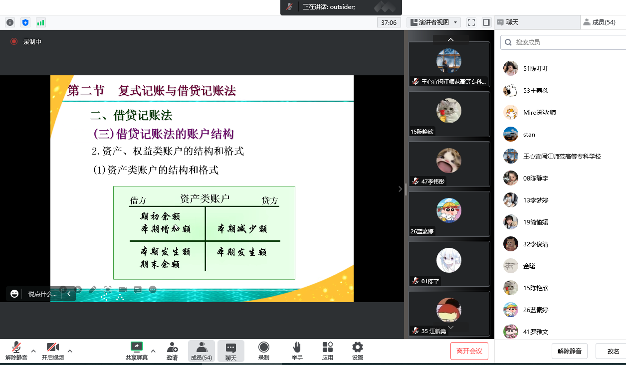 詹秀萍老师讲授的课程内容为《会计基础一》中会计科目与账户和复式记账与借贷记账法,授课对象为22级应用英语2班学生。云课堂形式新颖,内容丰富,教学逻辑清晰。课堂上詹秀萍老师不仅带领同学们巩固复习,同时通过现实生活实例引入新知,通过课堂练习进行重难点强化,学生们课堂上反馈及时、互动热烈。