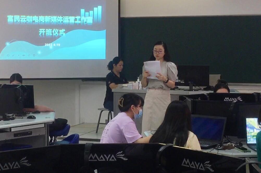2022年9月19日上午8:30,外语商贸学院与富民云咖集团共同开设的“富民云咖电商新媒体运营工作室”正式开班。出席开班仪式的有富民云咖企业导师高美雅老师、商贸教研室主任陈海燕老师、富民云咖电商新媒体运营工作室班主任肖阜老师,以及参与工作室的28位同学。