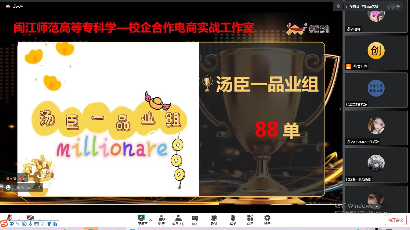2022年10月29日上午,外语商贸学院富民云咖电商新媒体运营工作室举行了结课典礼。由于疫情原因,本次典礼采用线上会议形式进行,出席结课典礼的有外语商贸学院院长何少娴、副院长卢燕红,富民云咖信息科技有限公司总经理魏丽琴、企业导师以及参加工作室的28位同学。
